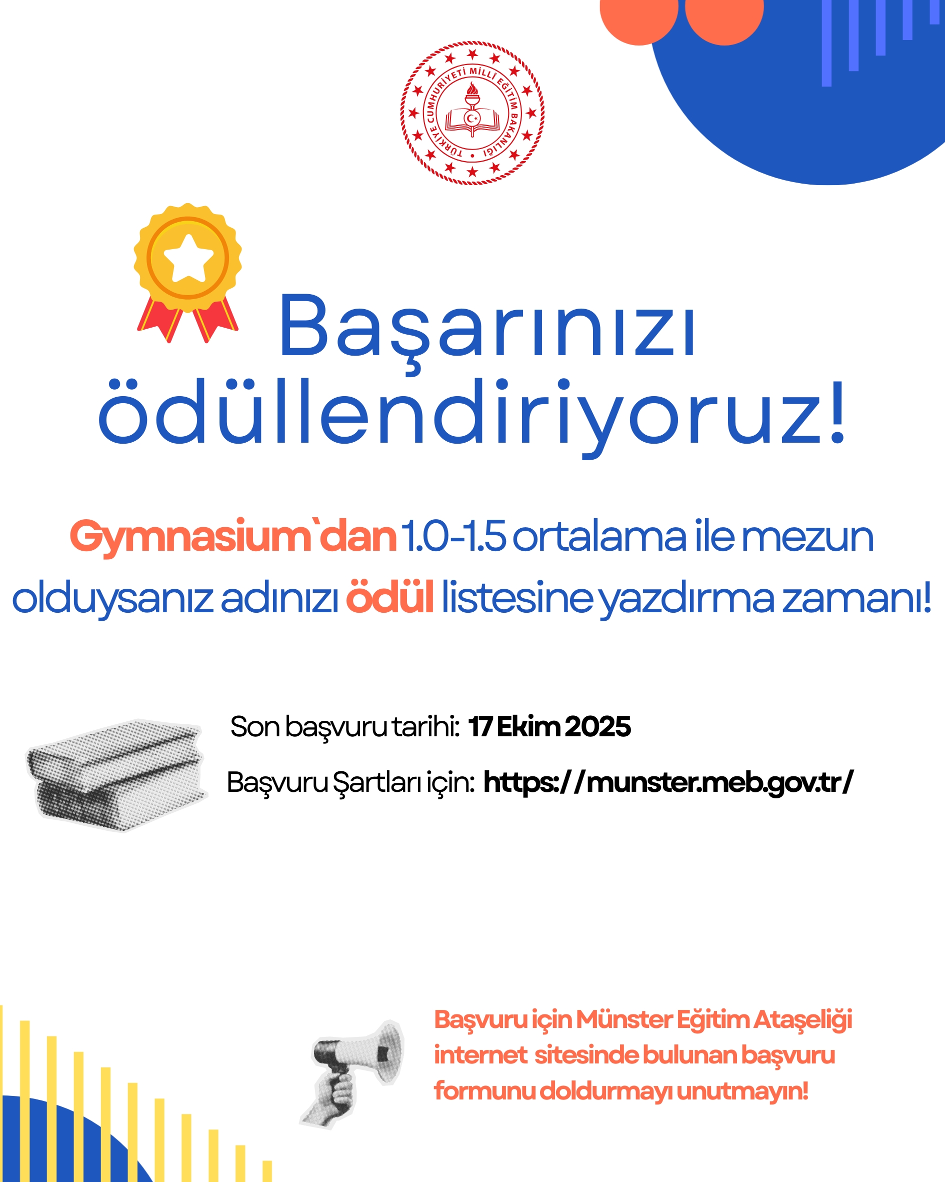 Bu kapsamda, 2024/2025 öğrenim yılında Başkonsolosluğumuz görev bölgesinde yer alan Gymnasium okullarından en yüksek not ortalaması ile mezun olan (1.0-1.5) Türk vatandaşı veya Türk kökenli öğrencilerimiz, başarılarının bir nişanesi olarak Başkonsolosluğumuz adına çeşitli ödüllerle onurlandırılacaktır.